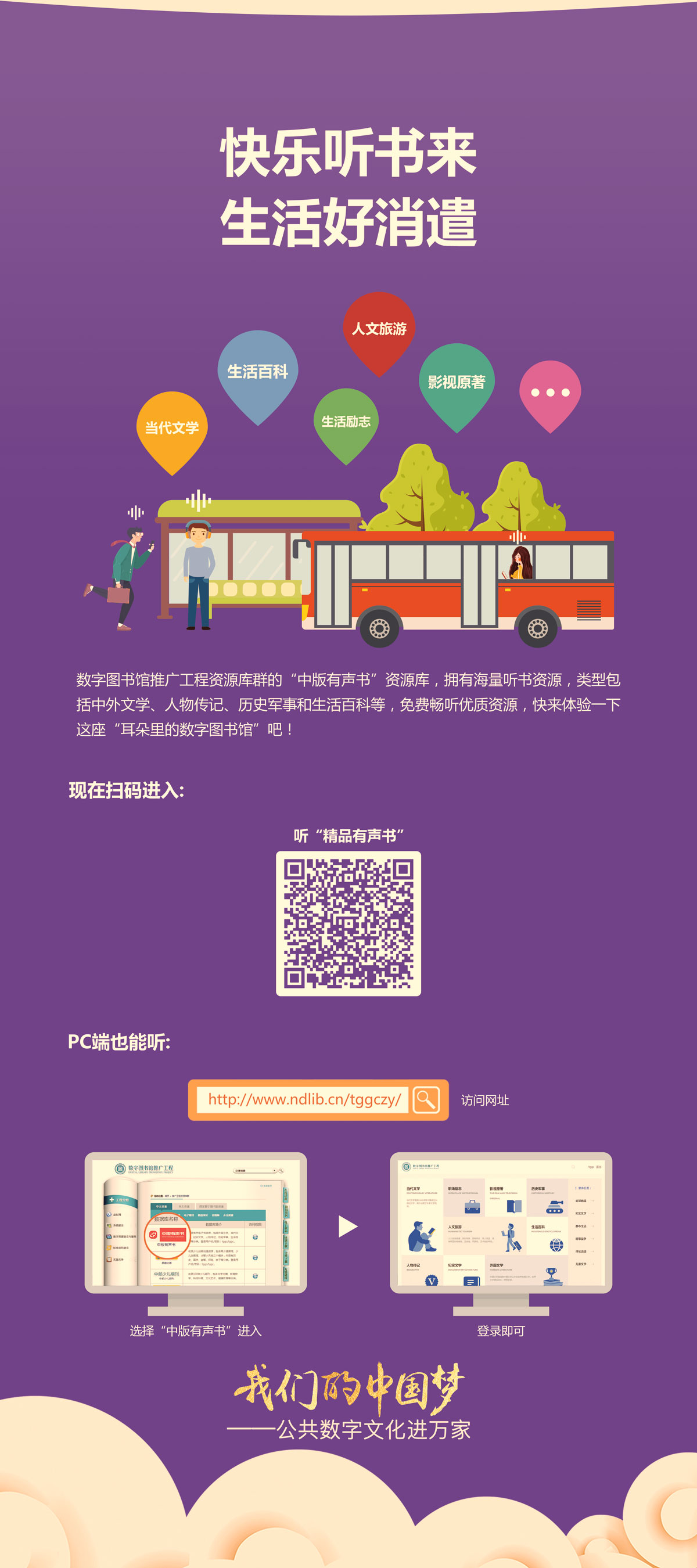 为进一步丰富春节期间群众文化生活,使数字图书馆服务惠及更广泛的社会公众,2019年春节期间(2019年1月28日至3月1日)由国家图书馆、贵州省图书馆、贵阳市图书馆联合开展“我的中国梦”——公共数字文化进万家活动。活动内容包括“今昔巨变·辉煌见证”新老照片征集、“美好生活”主题活动、“吉语贺岁·好书传情”电子有声贺卡、“书香博闻·欢启归程”在线趣味答题、“听赏群书·喜迎岁除”线下主题展览。欢迎读者朋友们积极参与线上线下活动。