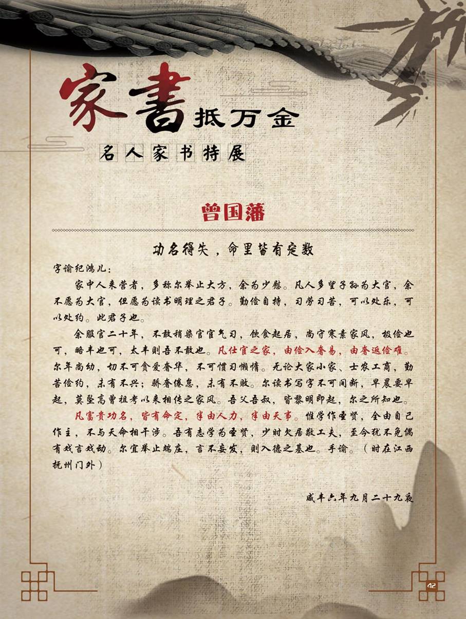 《家书抵万金——名人家书特展》主题展览汇聚了中国历代名人先贤的30封经典家书之作,包括毛泽东、周恩来、鲁迅、巴金等撰写的优秀家书。为了让观众深入、具象地了解作品,我们为每封家书打造了“家书档案”以及与内容相契合的珍贵历史照片,图义联袂,相得益彰,助力您在轻松、立体、富有文化魅力的阅读氛围中,开始一段愉快的观展之旅,欢迎社会各界朋友前来观展! 家书承载情感,文化薪火相传,在此呼吁万千家庭和社会各界,重视中华传统,重拾家书文化,传承经典家训,树立良好家风。