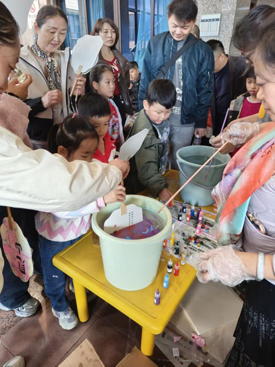 到了手工创作环节,在指导老师的指导和帮助下,读者们一一体验漂漆制扇的手工工艺——先选择自己心仪的两到三种色彩,将色漆滴入水中并用棍子缓慢搅拌出纹路